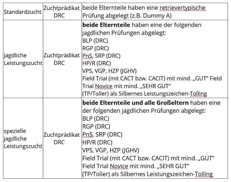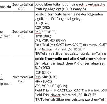 Das hat etwas mit den Vorfahren und den Prüfungen, die die Hunde abgelegt haben zu tun. Und diese Einordnung legen die Zuchtordnungen des DRC (Deutscher Retriever Club e.V.) fest. Um das Ganze etwas besser zu verstehen, gibt die Tabelle einen Überblick über die Begrifflichkeiten: